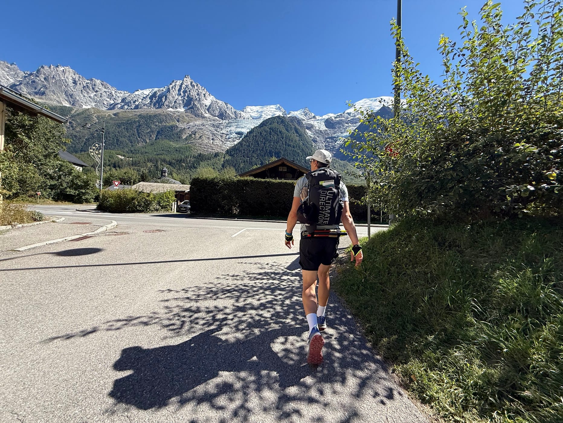 UTMB zazwyczaj startuje między 17-tą a 18-tą, my startowaliśmy o 14:10. To raczej niewielka różnica w kontekście temperatury w tak upalny dzień (w słońcu około 32 stopnie) te 3 h nie robią różnicy. Pierwsze kilometry po prostu szliśmy, bo jednak na początek, świeżo po transporcie i jeszcze na takiej patelni, to po prostu nie było sensu robić czegokolwiek innego.