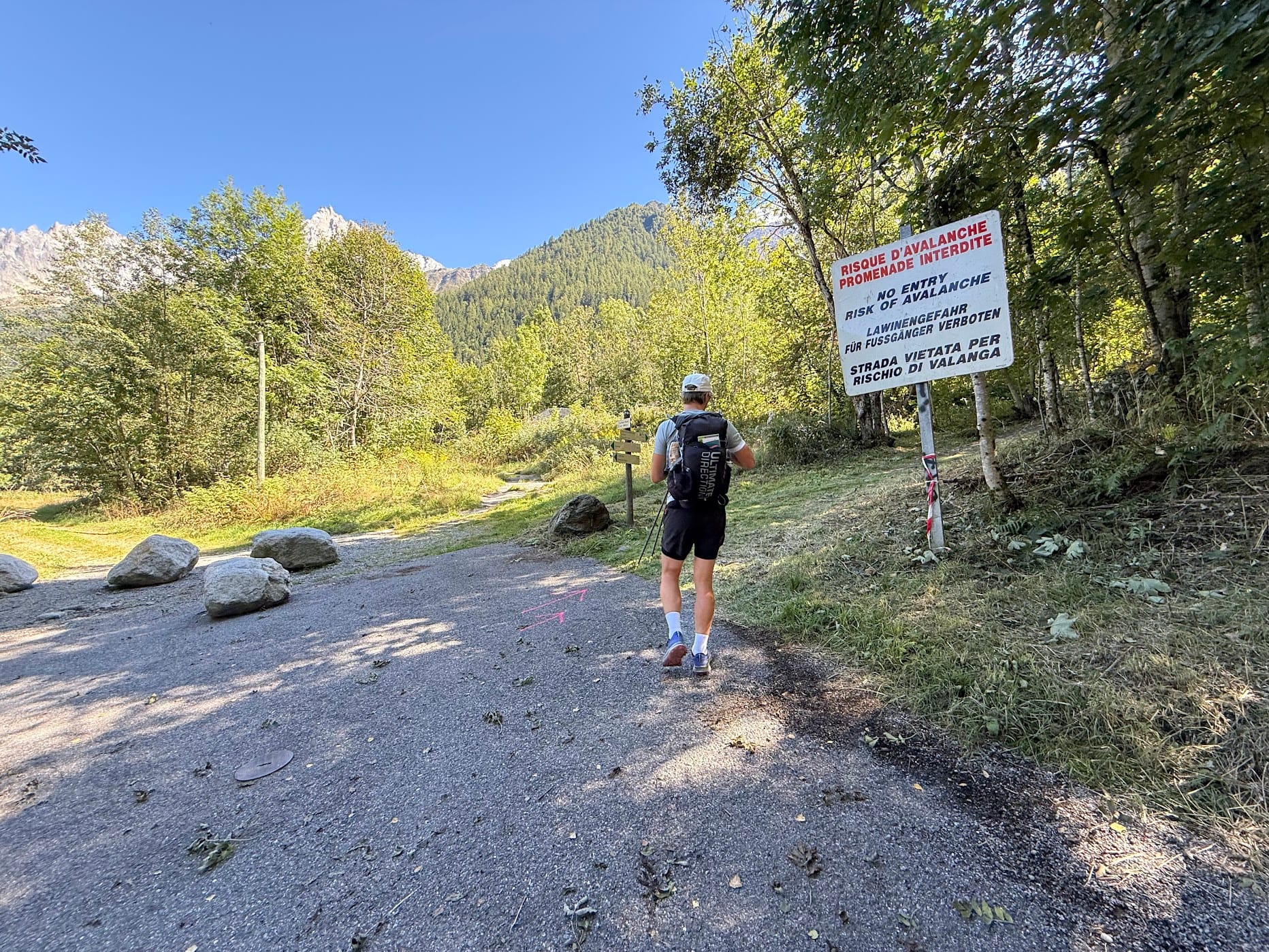 Wracając do planów B i C - no miałem je na wypadek, jakby mi się matematyka czasowa nie zgadzała. W miejscu, gdzie miał się ziścić "plan B", mieliśmy w nogach już 4 h oraz ponad 18 km. Oryginalnie trasa na ten dzień miała mieć około 35 km, z czego końcówka (ostatnie 12 km) miało być nudnym, zupełnie niewidokowym turlaniem się w górę doliny do miejsca, gdzie mieliśmy nocleg. W sporej części asfaltem. Gdybyśmy kontynuowali oficjalną trasę UTMB, to bylibyśmy na miejscu około 22:30. To oznacza, że nocleg i owszem, ale jedzenie to niekoniecznie. Przesympatyczna właścicielka noclegu Cecilia Demargne mówiła Adze, że "kolacja o 19 i nie może czekać z podawaniem innym gościom". Tak też nie mieliśmy kolacji na miejscu, a knajpy o tej porze miały być już pozamykane - miejscowość, w której planowaliśmy spać to w sumie wioska i niewiele się tam dzieje.