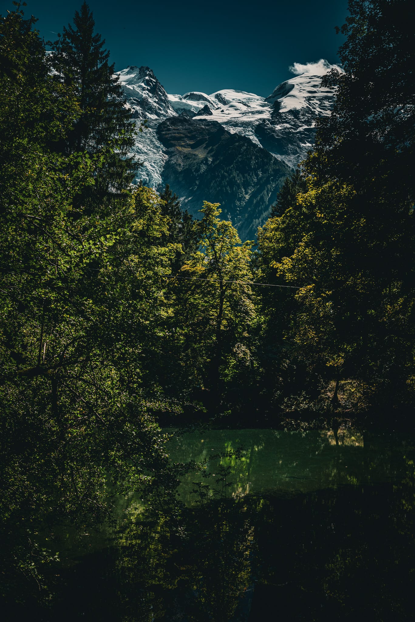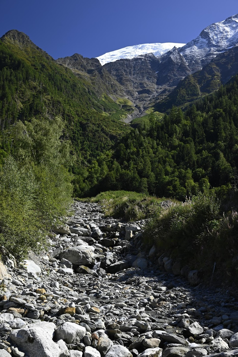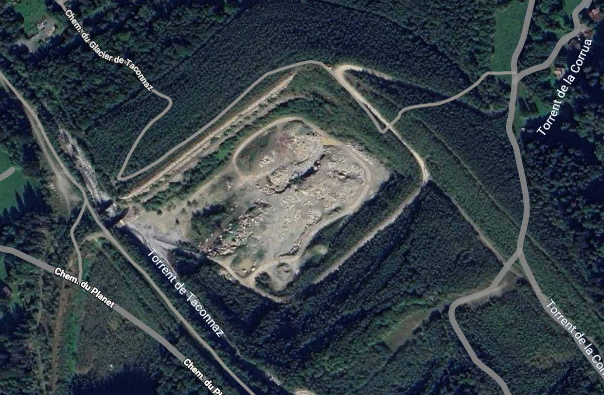 Od góry to wygląda tak jak poniżej i po prostu jest to wielka tama / zbiornik, który zatrzymuje wodę i kamienie wylatujące z gigantycznego żlebu, mającego początek w lodowcach Taconnaz i Bossons: