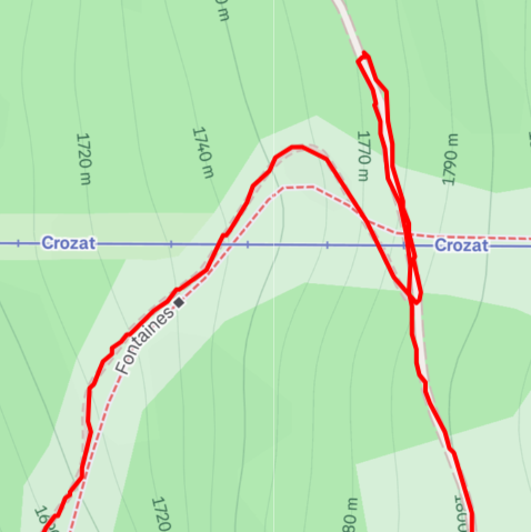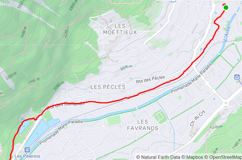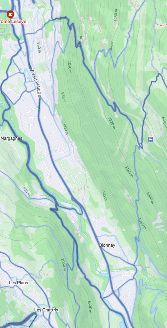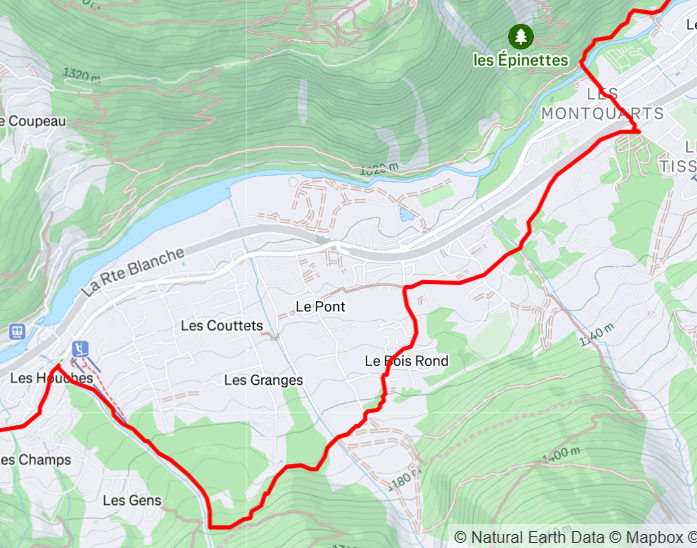 Warto dodać, że ten pierwszy odcinek UTMB, zanim się zaczną jakiekolwiek podbiegi, leci zazwyczaj inaczej. Jednak w tym roku 2025, w związku z jakimiś obsuwami ziemi, trasa leciała naokoło. Poniżej widać, jak to wyglądało - początek prawy-górny róg, koniec lewy-dolny. Równocześnie ten "detour" oznaczał wyjście z przyjemnego lasu i ponowne ugniatanie butami masy bitumicznej: