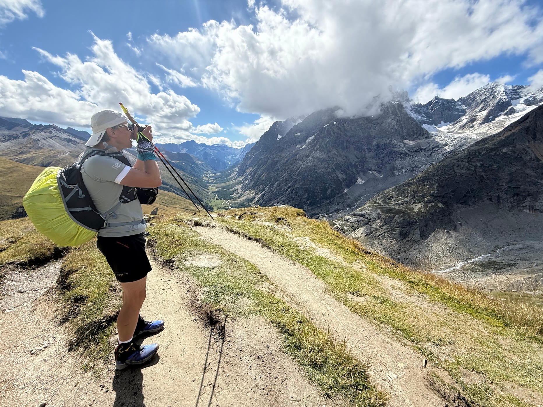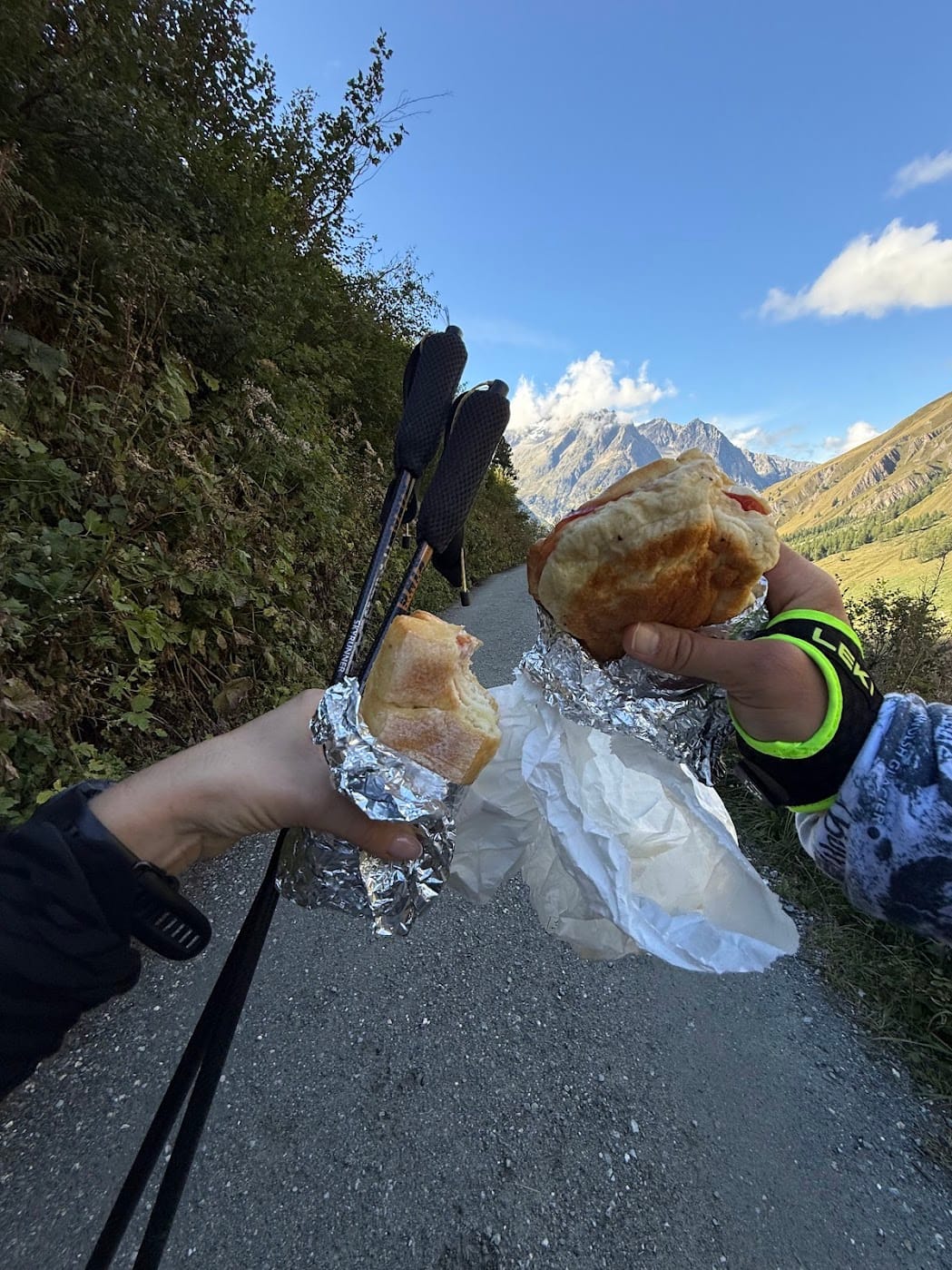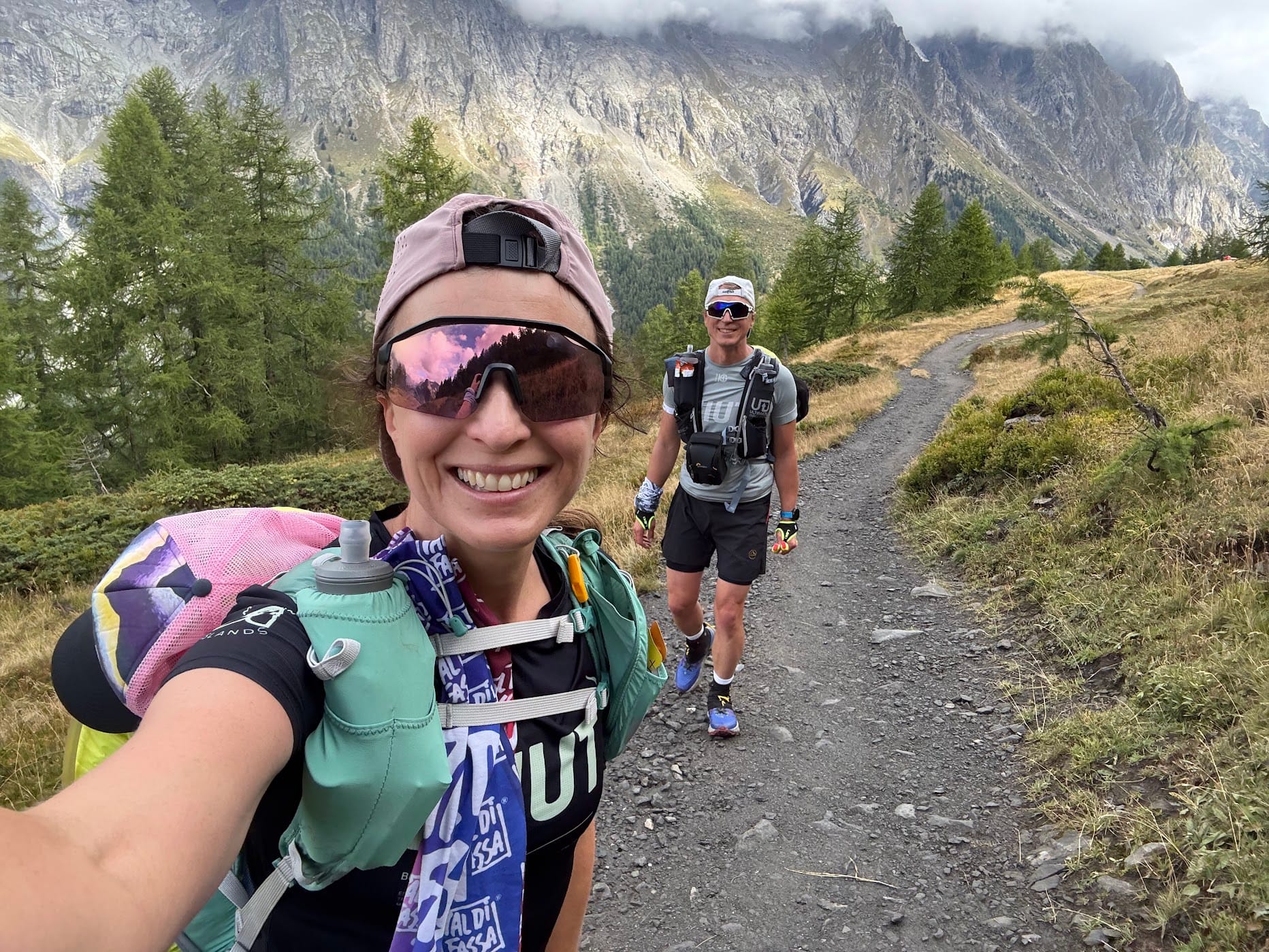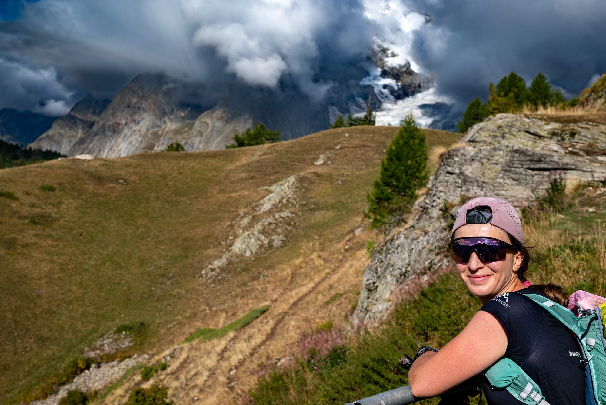 Po drodze Aga zgubi艂a 艣wi臋t膮 bufk臋 z MIUTa (pisa艂em w pierwszej cz臋艣ci, 偶e jednym z minus贸w naszych plecak贸w by艂y do艣膰 twarde ramionka pod sporym obci膮偶eniem; pakujemy pod nie bufki, 偶eby by艂o mi臋kko; no i czasem bufka wyleci). No i jak si臋 Aga zorientowa艂a, to zdj臋艂a plecak i polecia艂a kilometry z powrotem szuka膰, bo przecie偶 drugi raz MIUTa nie pobiegnie (tzn. jak j膮 znam, to lepiej "nigdy nie m贸wi nigdy" 馃槂). Wr贸ci艂a, znalaz艂a, szcz臋艣liw膮 z艂apa艂em w obiektyw w ca艂kiem pi臋knych okoliczno艣ciach Aosty (zauwa偶cie wspomnian膮 bufk臋 w lewej d艂oni!):