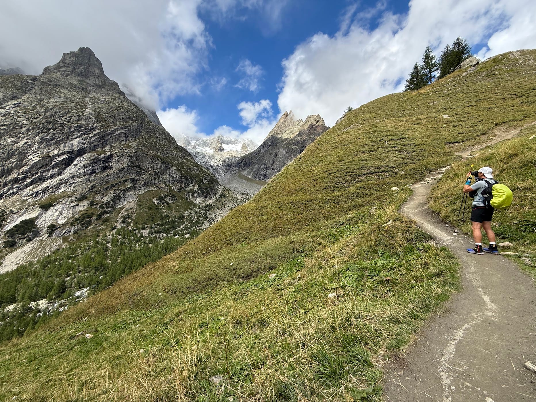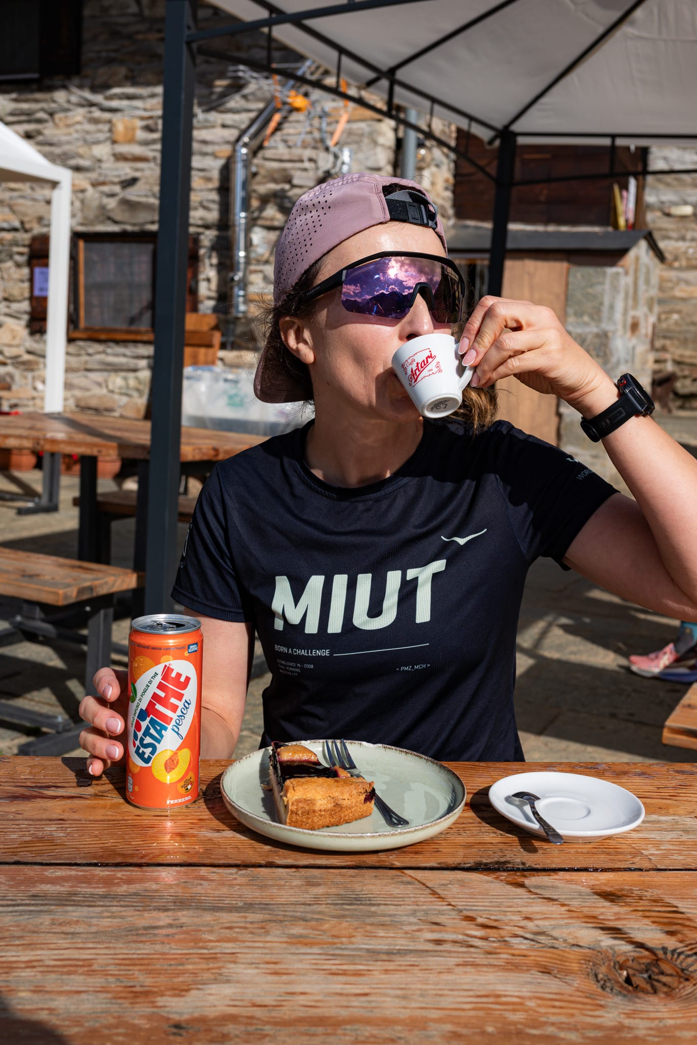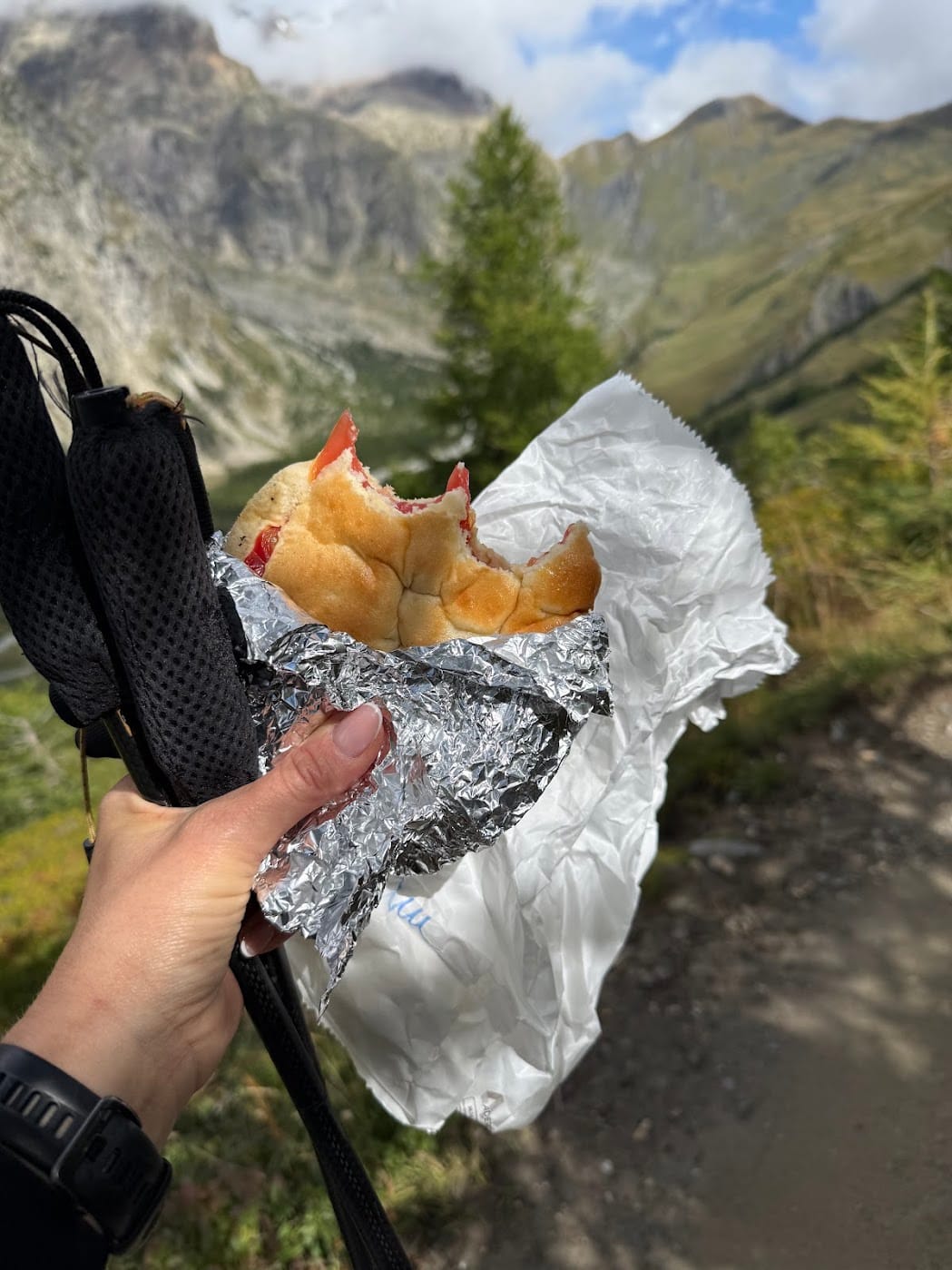 Po drodze Aga zgubi艂a 艣wi臋t膮 bufk臋 z MIUTa (pisa艂em w pierwszej cz臋艣ci, 偶e jednym z minus贸w naszych plecak贸w by艂y do艣膰 twarde ramionka pod sporym obci膮偶eniem; pakujemy pod nie bufki, 偶eby by艂o mi臋kko; no i czasem bufka wyleci). No i jak si臋 Aga zorientowa艂a, to zdj臋艂a plecak i polecia艂a kilometry z powrotem szuka膰, bo przecie偶 drugi raz MIUTa nie pobiegnie (tzn. jak j膮 znam, to lepiej "nigdy nie m贸wi nigdy" 馃槂). Wr贸ci艂a, znalaz艂a, szcz臋艣liw膮 z艂apa艂em w obiektyw w ca艂kiem pi臋knych okoliczno艣ciach Aosty (zauwa偶cie wspomnian膮 bufk臋 w lewej d艂oni!):