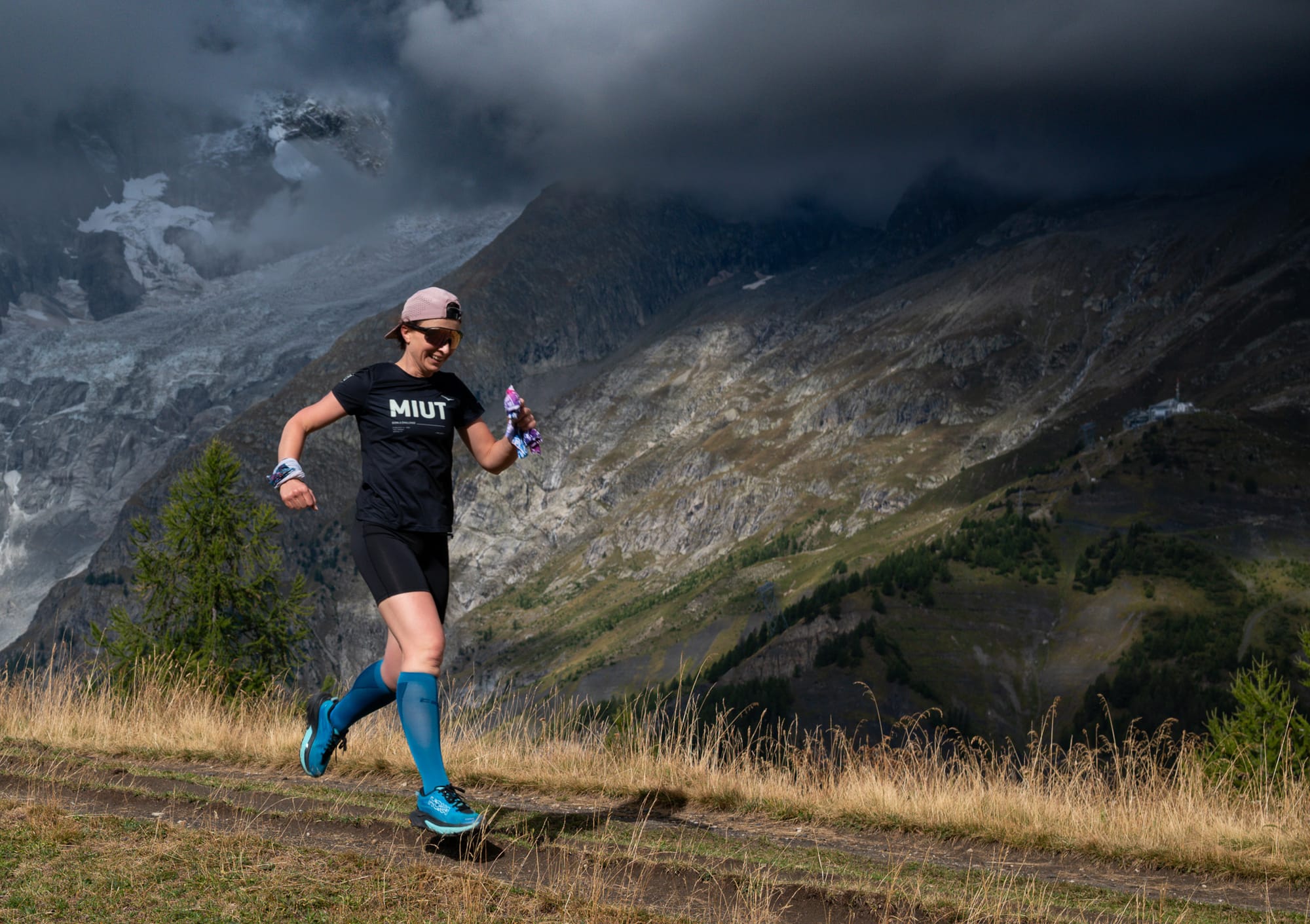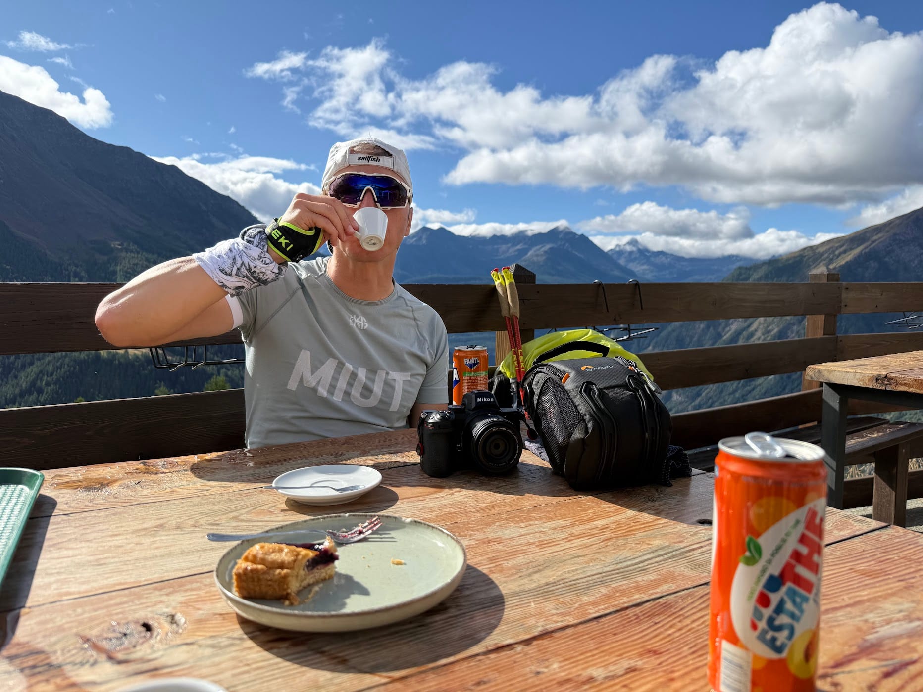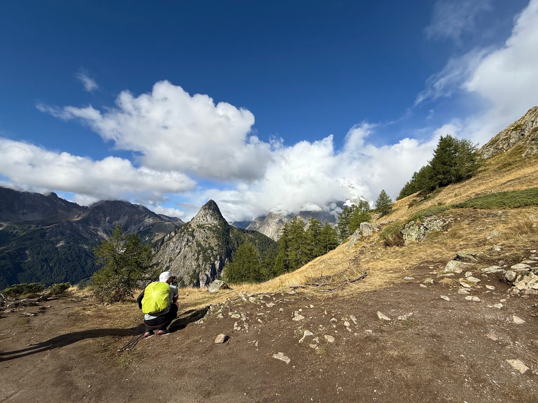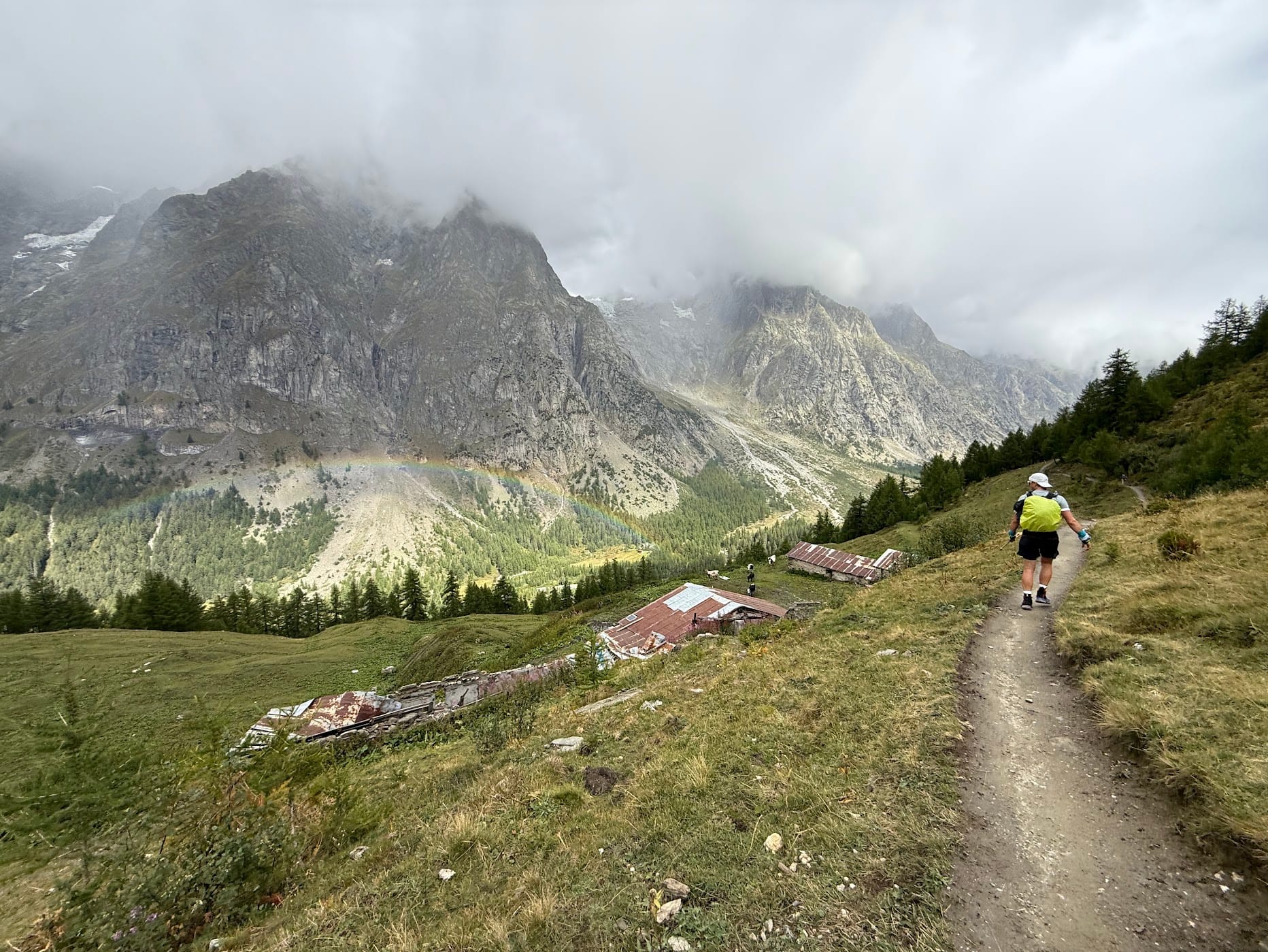 Po drodze Aga zgubi艂a 艣wi臋t膮 bufk臋 z MIUTa (pisa艂em w pierwszej cz臋艣ci, 偶e jednym z minus贸w naszych plecak贸w by艂y do艣膰 twarde ramionka pod sporym obci膮偶eniem; pakujemy pod nie bufki, 偶eby by艂o mi臋kko; no i czasem bufka wyleci). No i jak si臋 Aga zorientowa艂a, to zdj臋艂a plecak i polecia艂a kilometry z powrotem szuka膰, bo przecie偶 drugi raz MIUTa nie pobiegnie (tzn. jak j膮 znam, to lepiej "nigdy nie m贸wi nigdy" 馃槂). Wr贸ci艂a, znalaz艂a, szcz臋艣liw膮 z艂apa艂em w obiektyw w ca艂kiem pi臋knych okoliczno艣ciach Aosty (zauwa偶cie wspomnian膮 bufk臋 w lewej d艂oni!):
