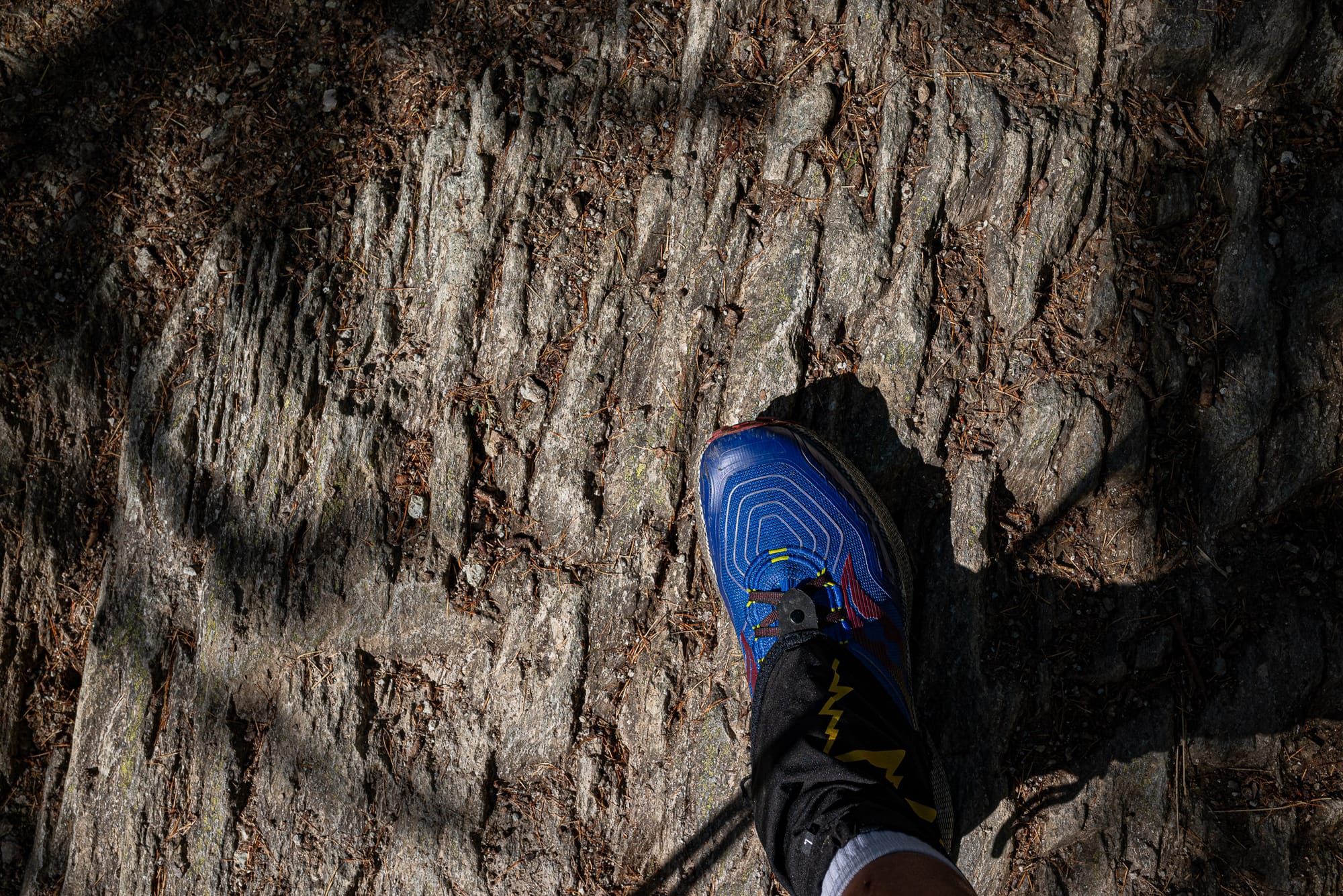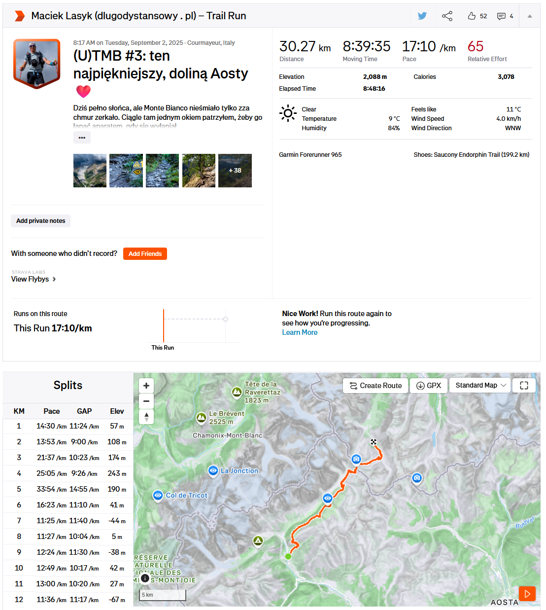 Na zbiegu niestety zacz臋艂y mi dawa膰 w ko艣膰 stopy. M贸j dob贸r but贸w na t臋 wyrypk臋 nie by艂 specjalnie wyrafinowany. Po prostu wybra艂em najgorzej z tego, co mia艂em dost臋pnego w domu. Pad艂o na Saucony Endorphin Trail - 艣wietny but, podeszwa ta sama co w Peregrine (idealna na Tatry i Alpy), du偶a amortyzacja z Endorfiny (kosztem stabilno艣ci troch臋), sporo wagi i zupe艂nie zabudowana stopa. Niby same plusy, ale posiada艂y jeden, wielki minus - prawie 偶adnej wentylacji. By艂o w nich 艣wietnie w niskich temperaturach oraz na mokro, bo nie przecieka艂y tak szybko. Jednak w upale to by艂 koszmar. Tego trzeciego dnia od pocz膮tku ju偶 czu艂em, 偶e pod palcami jest 藕le, wi臋c miejscami ju偶 nie dawa艂em rady biec. Na zbiegach robi艂o si臋 gorzej. Aga oczywi艣cie chcia艂a mnie nakuwa膰 (ultraska!) w trasie, ale ja mam swoj膮 godno艣膰 (ja maratony miejskie biegam! 馃槃).