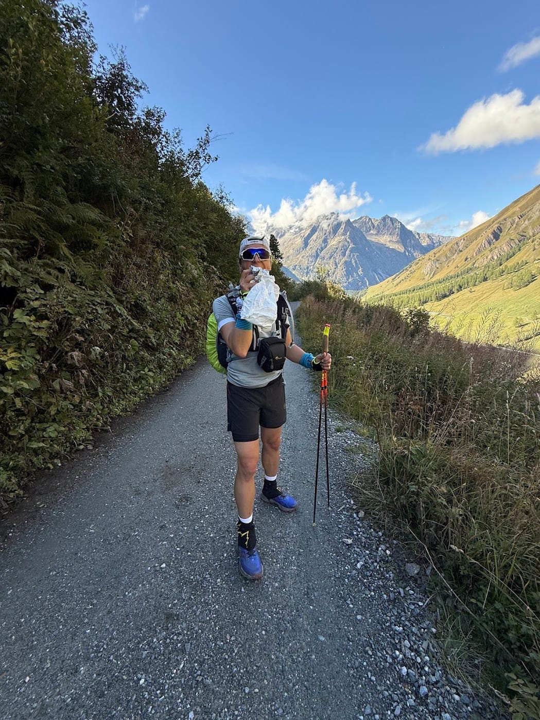 St膮d ju偶 prosty zbieg szerok膮 drog膮 szutrow膮 do La Fouly. A i jeszcze jedna mikro - awantura, poniewa偶 wybrali艣my z艂膮 drog臋 - tak膮, kt贸r膮 UTMB nie leci! Wi臋c Aga chcia艂a si臋 wraca膰 pod ten Chalet, bo tam min臋li艣my odbicie w bok. Ja oponowa艂em i na zgod臋 zaproponowa艂em kanapk臋: